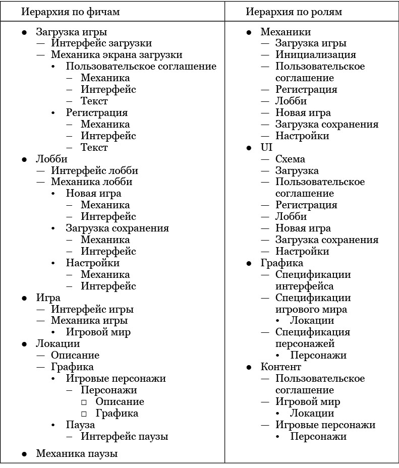 Это разделение на блоки может проходить как внутри описания каждой отдельной игровой механики, так и на более высоком уровне. Мы можем перечислять все элементы, относящиеся к каждой отдельной фиче внутри нее, и объединять описания отдельных аспектов всех фичей в большие разделы, например посвященные всем функциональным описаниям, всем интерфейсам, всем персонажам и т. п.