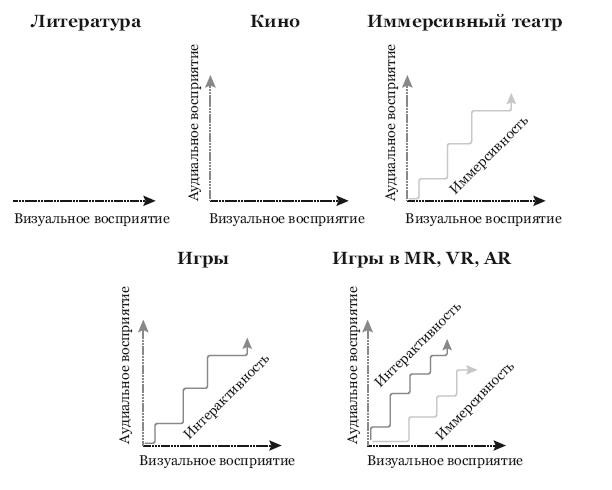 Абсолютно уникальными видами технологических медиа являются все типы «реальностей»: дополненная – AR (Augmented Reality), виртуальная – VR (Virtual Reality), смешанная – MR (Mixed Reality). Тут мы имеем дело и с иммерсивностью, то есть погружаемся в той или иной степени в некий искусственно созданный мир в VR, с помощью AR и MR, находясь одновременно в реальном и виртуальном пространстве, и с интерактивностью, становясь непосредственными участниками происходящих событий и действий.
