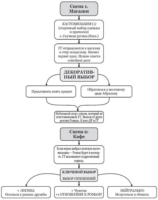 Это выборы, результат и последствия которых видны сразу. Для того чтобы игрок понимал, что ждет его дальше, мы обязательно поясняем это. Соответственно, если у нас идет гардероб с переменой одежды, то при выборе платного и более стильного варианта мы получаем реакцию восхищения на него и, напротив, вздох сожаления при решении нарядиться в обычный костюм. Если на перекрестке у нас лежат меч и волшебная палочка, то очевидно, что, выбирая оружие, мы пойдем по пути воина, а при выборе магического предмета – по пути колдуна. При выстраивании отношений с другими персонажами будет ясно, что если мы кому-то нагрубим в ответ, то снизим симпатию, а если ответим радушием, то сделаем шаг на пути к крепкой дружбе. Естественно, все зависит от конкретной истории, а данные примеры служат лишь для общего представления.