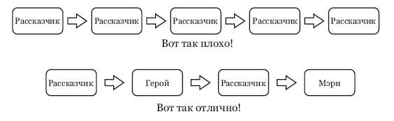 Слова автора должны обязательно разбиваться фразами персонажей. В идеале не должно идти больше пяти реплик рассказчика подряд, так как читать текст без картинок персонажей игроку не так интересно.