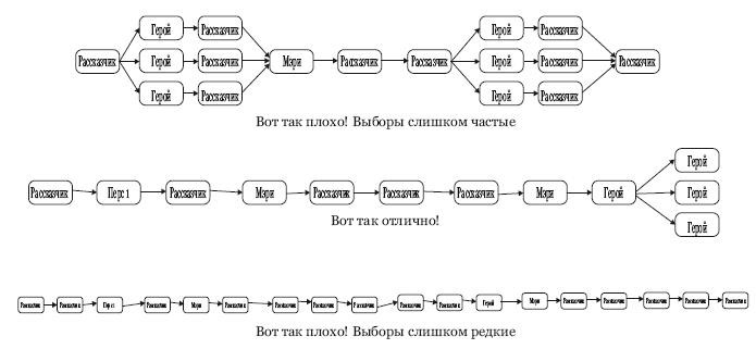 В среднем игроку надо давать возможность вариантов выбора через каждые 10–12 реплик. Слишком часто или слишком редко – это плохо и выводит из состояния потока.