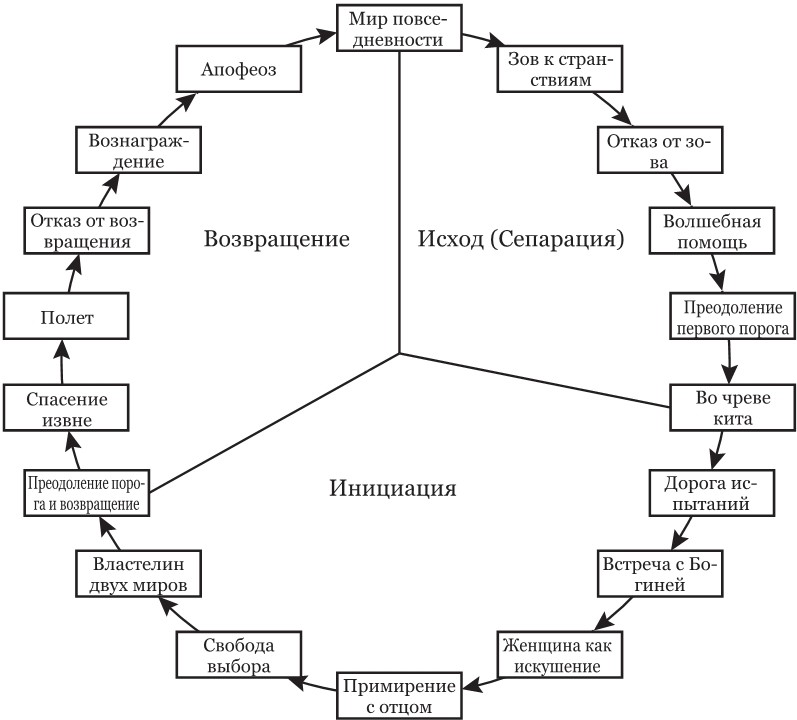 Пожалуй, одним из главных трудов, который повлиял на развитие современного сценарного искусства, является книга специалиста по мифологии и религии Джозефа Джона Кэмпбелла «Тысячеликий герой». В ней автор на основе глубокого анализа мифотворчества и легенд разных народов выводит свою идеальную формулу пути трансформации персонажа. Она состоит из трех этапов: исход, инициация и возвращение.