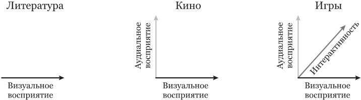 Сюжет игры можно познавать не только визуально и аудиально, но и эмпирически. На собственном опыте можно проникнуться представленным миром и принять непосредственное участие в игровой истории. В итоге, помимо визуальной и аудиальной составляющей, у нас появляется новая плоскость восприятия произведения – интерактивность. В игре мы оперируем не художественно-выразительными средствами или тем, что должен увидеть на экране зритель, а прежде всего опираемся на интерактивность, поэтому повествование должно отталкиваться от глаголов, связанных с взаимодействием игрока и игрового мира. Это описание того, что делает персонаж на протяжении всего прохождения. Именно в его действиях и получаемом через них опыте и заключена сама история. Платформер, например, может превратиться в преодоление препятствий и трудностей на пути каждого и стать олицетворением борьбы с судьбой за собственное счастье в этом мире. Так, Силия Пирс в эссе «Нарративные пространства» говорит, что разные архитектурные сооружения в игре можно рассматривать как истории, они имеют свой глубоко заложенный нарратив. Например, в строительстве города можно увидеть историю экспансии территорий. Видеоигры, по убеждению Пирс, – следующий шаг эволюции нарративных пространств. В выстраивании линейной структуры нарратива в игре мы можем учитывать наработки всех трех видов нарративного искусства: и литературного произведения, и кинодраматургического творения, и собственно игрового направления.