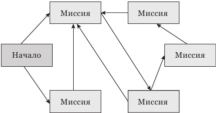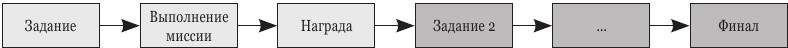 Повествование в линейной структуре может передаваться посредством окружающих диалогов (см. главу 8 «Диалоги»), левел-дизайна, кат-сцен, NPC, внутриигровых текстов, звукового сопровождения, спецэффектов и других инструментов, но есть общая система. Она обычно состоит из трех элементов: задание – выполнение миссии – награда – и так далее, пока игрок не дойдет до финала или же будет продолжать, если игра бесконечна. Обычно в эту схему отлично вписывается квестовая система (см. главу 7 «Квестовые системы»).
