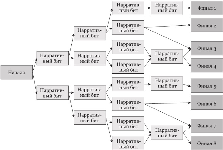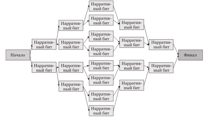 Мы предлагаем ветвления с так называемыми нарративными битами. Во многих играх они совпадают с квестами (см. главу 7 «Квестовые системы»), однако в визуальных новеллах и интерактивном кино они являются особыми узлами повествования, на которые в том числе влияют выборы игрока.