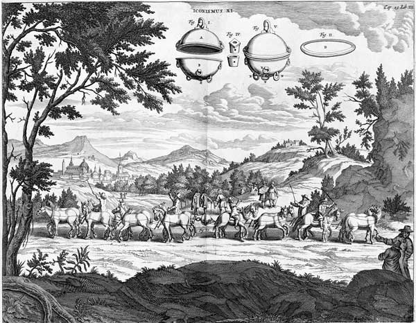 Шел 1657 год. Две команды, каждая по восемь лошадей, пытаются расколоть железный шар на рыночной площади в Магдебурге. Тщетно. Но вот в дело вмешивается маленькая девочка и поворачивает кран, прикрепленный к шару. Шар тут же распадается на две полусферы, которые держались вместе только благодаря силе вакуума. То, что было не под силу 16 лошадям, удалось сделать ребенку. Зрители убеждены, что стали свидетелями чистой магии.