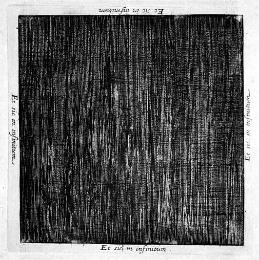 Пожалуй, больше всего к этому наивному представлению о бесконечном подходит иллюстрация сэра Роберта Фладда: перед главой его «Метафизики», посвященной небытию, мы видим черный прямоугольник. Над каждой из четырех его сторон написано: et sic in infinitum – «и так до бесконечности». Бесконечность – это когда все продолжается и продолжается.