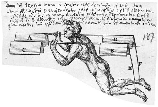 Анонимная гравюра на дереве с изображением испытания летательного аппарата, проведенного слесарем Беснье, которое Лейбниц приложил к своему плану кабинета редкостей. Он был свидетелем аналогичного испытания в Париже