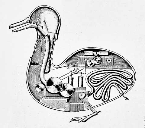 Этот шедевр восхитил зрителей еще больше, чем флейтист, прежде всего потому, что утка имела пищеварительную систему. Правда, кашица, выходившая из задней части утки, не была продуктом переваривания зерен, которыми ее кормили: она заранее пряталась в небольшой емкости внутри механической птицы.