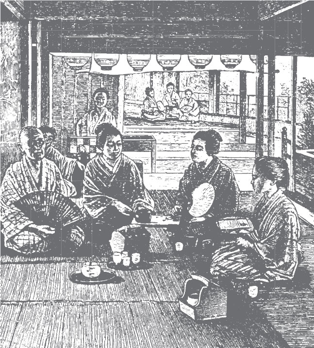 Первую собственно чайную комнату создал Сэн-но Соёки, известный под более поздним именем Рикю, величайший из всех чайных мастеров, который в XVI веке под покровительством Тайко Хидэёси установил обрядовые правила чайной церемонии и довел их до высокого уровня совершенства. Пропорции чайной комнаты были ранее определены Дзёо – известным чайным мастером XVI века. Первоначально чайная комната представляла собой всего лишь часть обычной гостиной, отгороженной ширмами для того, чтобы, собравшись там, можно было пить чай. Такая отгороженная часть называлась «какой» («отгороженное пространство»); это название до сих пор используется по отношению к тем чайным комнатам, которые находятся в доме и не являются отдельными постройками.