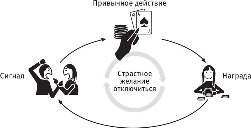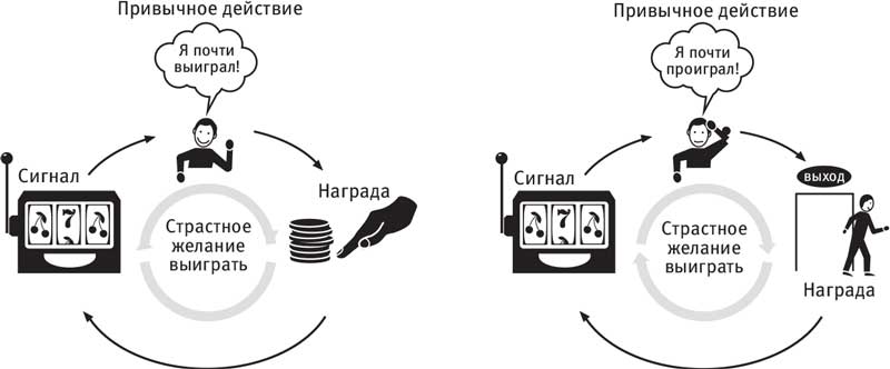 Обе группы видели одно и то же событие, однако по-разному расценивали его с точки зрения неврологии. Люди с патологической страстью к азартным играм испытывали психический подъем от близких попаданий – согласно гипотезе Хабиба, это объясняет, почему они играют намного дольше, чем все остальные: близкое попадание запускает привычки, которые подталкивают их сделать еще одну ставку. У непатологических игроков близкое попадание запускает привычки, которые говорят: «Стоп, пора заканчивать, пока все не зашло слишком далеко».