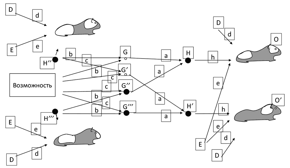 Рис. 11. Первая путевая диаграмма Сьюалла Райта, показывающая все факторы, влияющие на окраску меха у морских свинок: D — факторы внутриутробного развития (от зачатия до рождения); E — средовые факторы (после рождения); G — генетические факторы от каждого из родителей; H — объединенные наследственные факторы от обоих родителей, O, O’ — потомство. Целью анализа была оценка силы воздействия факторов D, E, H (на диаграмме приведенных как d, e, h).