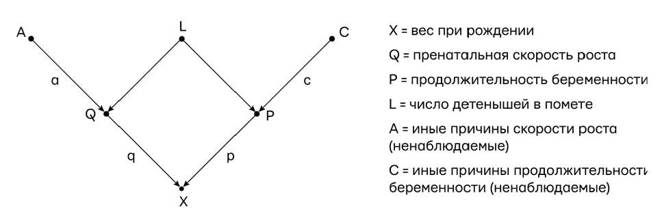 X — это вес детеныша при рождении. P и Q — два фактора, о которых известно, что они влияют на вес детеныша: P — продолжительность беременности, а Q — скорость роста в утробе матери. L — это число детенышей в помете, которое влияет сразу и на P, и на Q (при большом помете детеныши растут медленнее, а беременность длится меньше). Важно обратить внимание, что X, P и L можно измерить для каждого животного в отдельности, а Q — нельзя. Наконец, A и C — внешние причины, по которым у нас нет данных (т. е. наследственные и средовые факторы, влияющие на продолжительность беременности и скорость внутриутробного развития вне зависимости от числа детенышей в помете). Важное предположение, что эти факторы не зависят друг от друга, выражается отсутствием стрелки между ними, равно как и причины, влияющей на оба этих фактора.