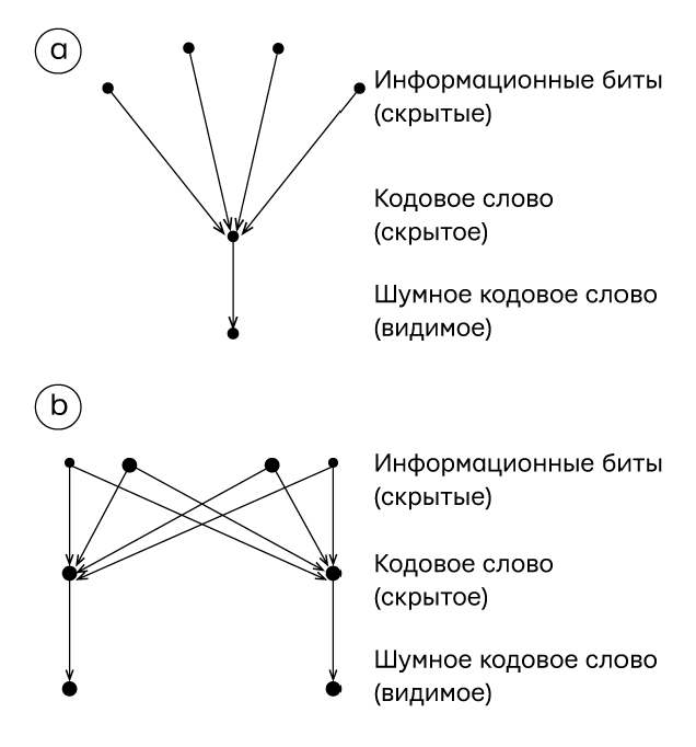 На рис. 20a показано, как работает обычный код. Биты информации, которые поступают в телефон, когда вы говорите, показаны в первом ряду. Они кодируются любым способом — назовем его код A — в кодовые слова (второй ряд), которые потом принимаются с некоторыми ошибками. Это диаграмма — байесовская сеть, и мы можем использовать распространение убеждений, чтобы вывести из полученных битов, каковы были биты информации. Однако это никак не улучшит код А.