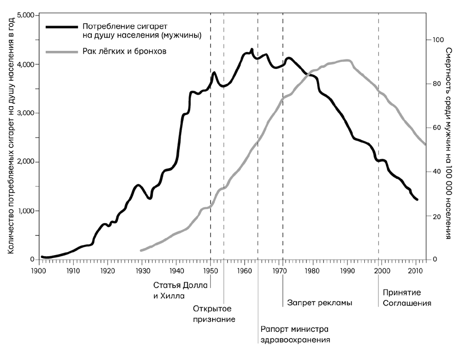 К 1952 году доля сигарет на табачном рынке взлетела вверх с 2 до 81 %, да и сам рынок очень вырос. Эта кардинальная смена привычек целой страны имела неожиданные последствия для здоровья нации. Даже в первые годы ХХ столетия имелись подозрения, что курение нездорово, что оно «раздражает» горло и вызывает кашель. К середине века накапливающаяся информация становится все более зловещей. До распространения сигарет рак легких встречался так редко, что врачу обычно случалось сталкиваться с ним лишь однократно на протяжении всей своей практики. Однако за период с 1900 до 1950 года когда-то редкое заболевание стало встречаться вчетверо чаще, а к 1960 году оно стало самой распространенной формой рака среди мужчин. Столь значительное изменение в распространенности смертельного заболевания нуждалось в объяснении.