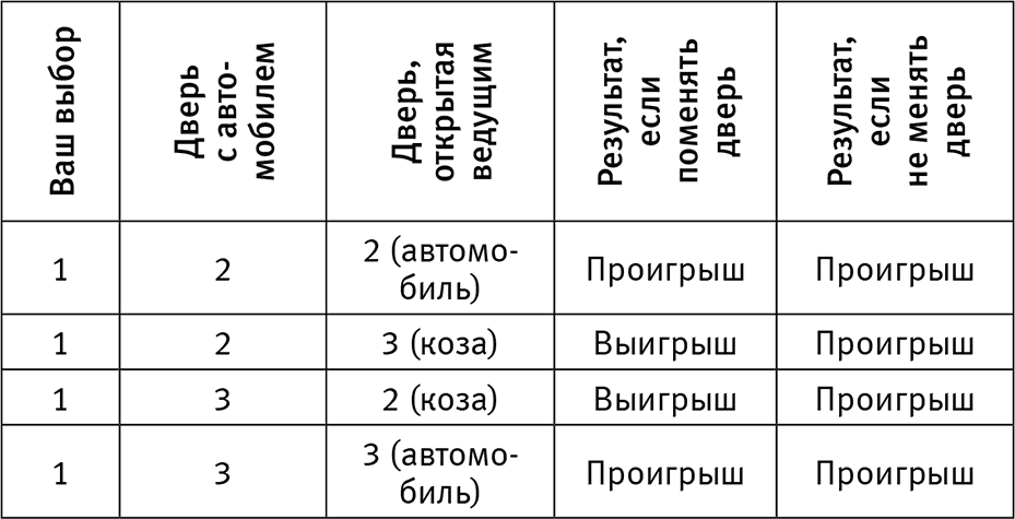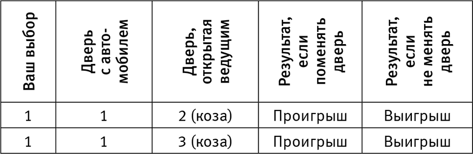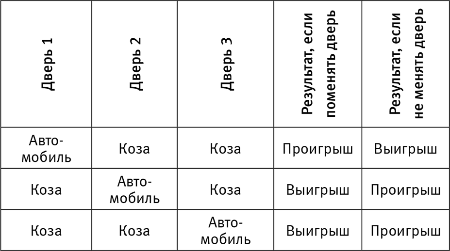 Таблица 5. Три сочетания дверей и коз в «Заключим сделку» показывают, что вариант сменить дверь вдвое привлекательнее
