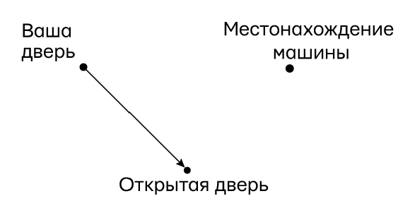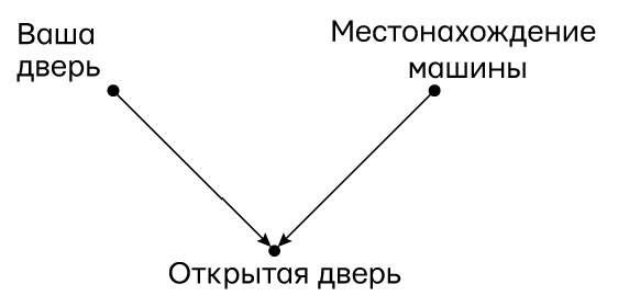 Давайте воспользуемся нашим любимым приемом и нарисуем диаграмму причинности, которая сразу же покажет, чем отличаются две телеигры, реальная и воображаемая. Во-первых, на рис. 32 показана диаграмма для настоящей игры «Заключим сделку», где Монти Холл должен открыть дверь, за которой нет машины. Отсутствие стрелки между вашей дверью и местонахождением автомобиля означает, что ваш выбор двери и выбор продюсера, где поставить машину, не зависят друг от друга. Так мы явно исключаем возможность чтения мыслей со стороны продюсеров (или с вашей стороны!). Но еще важнее две стрелки, присутствующие на диаграмме. Они показывают, что на открывшуюся дверь повлиял и ваш выбор, и выбор продюсеров. Дело в том, что Монти Холл должен открыть дверь, отличную и от «вашей двери», и от «местонахождения автомобиля» — ему необходимо принять в расчет оба фактора.