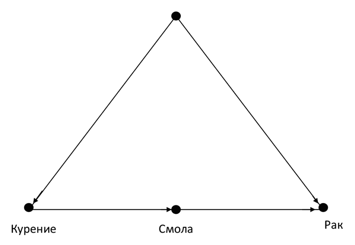 Предположим, что исследователи прошлого смогли измерить отложения смол в легких курильщиков. Еще в 1950-х это называлось в качестве одной из промежуточных стадий в развитии рака легких. Предположим также, что мы, совсем как министр здравоохранения, хотим исключить гипотезу Р. Э. Фишера о том, что ген курильщика является конфаундером по отношению к привычке курить и раку легких. Тогда ситуацию выше описывает каузальная диаграмма на рис. 41.