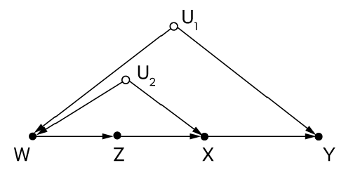 Еще одна причина, по которой do-исчисление остается необходимым, — это прозрачность. Когда я писал эту главу, Баренбойм (ныне профессор в Университете Пердью) прислал мне новую головоломку — диаграмму, в которой всего четыре наблюдаемые переменные: X, Y, Z и W — и две ненаблюдаемые: U1 и U2 (рис. 45). Он предложил мне определить, возможно ли оценить воздействие X на Y в этом случае. Здесь невозможно заблокировать пути черного хода и не выполняются условия для парадного входа. Я испробовал все свои любимые подходы и ранее выручавшие меня интуитивные аргументы, как за, так и против, и все же я не мог понять, как это сделать. Я не мог найти выхода из лабиринта. Но как только Баренбойм шепнул мне: «Попробуй do-исчисление!», ответ немедленно засиял во всей непосредственной простоте. Каждый шаг стал ясен и наполнен смыслом. Теперь это самая простая из известных нам моделей, в котором каузальное воздействие приходится оценивать методом, выходящим за рамки поправок черного хода и парадного входа.