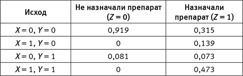 В нашем примере ответы очевидны, но мы не должны закрывать глаза на тот факт, что, отвечая на них, мы используем каузальную интуицию, которая запечатлевается, сохраняется и проясняется в виде каузальной диаграммы. Табл. 10 показывает наблюдаемую частоту исходов X и Y. Так, для 91,9 % людей, которым не назначался препарат, наблюдается исход X = 0 (не принимали препарат) и Y = 0 (уровень холестерина не упал). В этом есть смысл. У оставшихся 8,1 % исход был X = 0 (не принимали препарат) и Y = 1 (уровень холестерина упал). Очевидно, их состояние улучшилось по каким-то иным причинам. Обратите внимание также, что в таблице два нуля: не было никого, кому назначили бы плацебо (Z = 0), но кто тем не менее каким-нибудь образом добыл бы препарат (X = 1). В хорошо организованном рандомизированном исследовании, особенно в области медицины, где только у врачей есть доступ к экспериментальному препарату, дело обычно обстоит именно так. Предположение, что в выборке нет индивидов, у которых Z = 0, а X = 1, называется монотонностью.