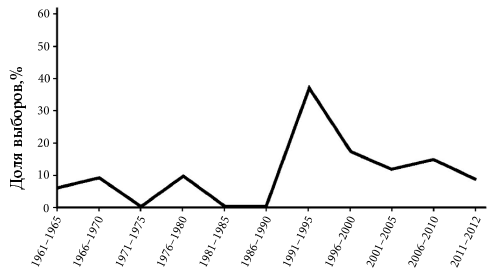 Приложение 6. Доля выборов, проигранных текущей властью в Африке южнее Сахары, по годам