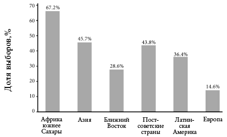 Приложение 14. Доля выборов с подкупом избирателей, по регионам, 2012–2016 гг.