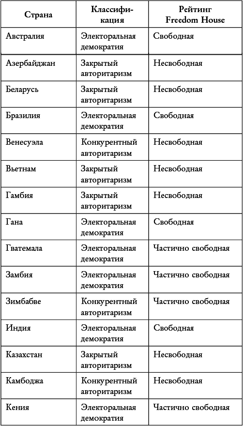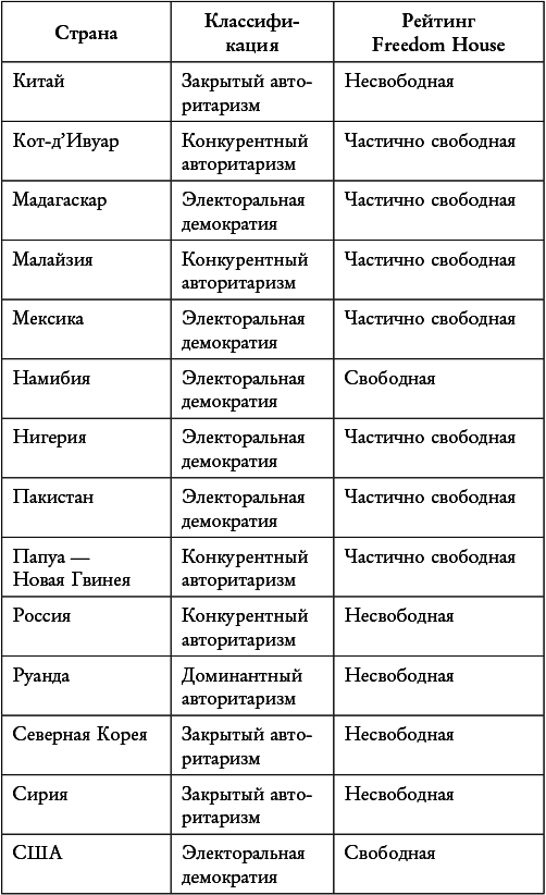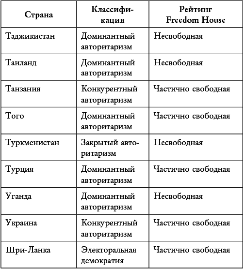 Примечание: все классификации основаны на последних доступных данных и могут незначительно отличаться от некоторых приведенных исторических примеров. Классификация режимов основана на шкале Polity IV, которая простирается от –10 (полная диктатура) до +10 (развитая демократия). Наш спектр выглядит так: закрытый авторитаризм (от –10 до –5), доминантный авторитаризм (от –5 до 0), конкурентный авторитаризм (от 0 до 5), электоральная демократия (от 6 до 10).