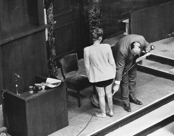 Сняв правый чулок и туфлю, Ядвига Дзидо отошла в сторону от свидетельской трибуны, приподняла свою юбку, продемонстрировав длинные и глубокие шрамы.