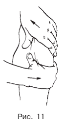 Ординарное разминание является наиболее простым и доступным видом. Оно имеет две фазы выполнения. Сначала тело мышцы плотно обхватывается пальцами по ходу мышечных волокон и слегка приподнимается (рис. 11). Большой палец и остальные четыре устремляются навстречу друг другу. Они выполняют вращательное движение, двигаясь по коже вперед. Во второй фазе пальцы возвращаются в исходное положение, но мышца не отпускается. Повторив движения несколько раз, массажист переходит на другой участок и выполняет те же самые движения до тех пор, пока не будет промассирована вся зона верхней части спины. При этом ладонь должна быть все время плотно прижата к коже. Мышца обхватывается настолько плотно, что между пальцами и кожей не остается никакого зазора. Это также способствует более глубокому массированию. Пациент должен хорошо чувствовать воздействие от разминания, так как оно выполняется не поверхностно, а глубоко.