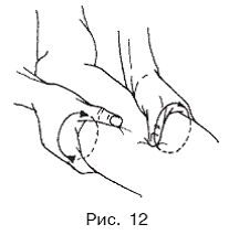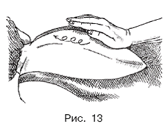 При кругообразном разминании массирование может осуществляться концевыми фалангами больших пальцев (рис. 13) или концевыми фалангами четырех пальцев. В последнем случае кисть руки должна располагаться так, чтобы большой палец проходил вдоль мышечных волокон, а четыре других пальца располагались по диагонали к мышцам. Разминание производится расслабленным большим пальцем, плавными движениями. В это время остальные пальцы захватывают мышцу и производят надавливание на массируемый участок. Пальцы могут быть разведены в стороны или плотно прижаты друг к другу.