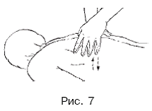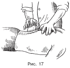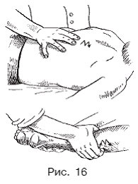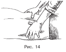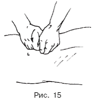 Надавливание выполняется короткими быстрыми движениями концевыми фалангами больших пальцев. Кисти при этом находятся на расстоянии 8-10 см друг от друга. Надавливание совершается в темпе 20—25 раз в минуту. Этот прием можно осуществлять с отягощением. Во время массирования кисти рук будут находиться рядом, иногда касаясь друг друга (рис. 15).