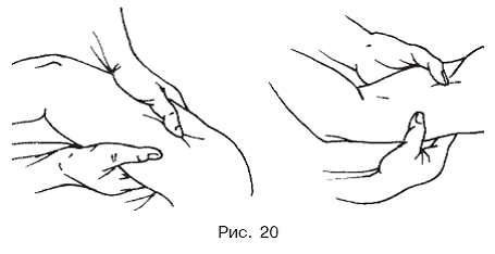 Для продольного разминания массажист использует большие пальцы рук (рис. 20): их отводят в стороны и противопоставляют четырем остальным пальцам, которые нужно немного согнуть. Большой палец захватывает мышцу на участке и стремится к четырем остальным, в результате чего происходит сдавливание мышцы с обеих сторон. Кисти рук массажиста должны находиться близко друг к другу, при этом пальцы правой руки располагаются чуть выше, чем пальцы левой руки. При продольном разминании большими пальцами кожа сдвигается от себя. При выполнении приема большой палец левой руки может касаться большого пальца правой. Разминание на одном участке производится в течение 15—20 секунд, затем происходит смена положения. Кисть продвигается вперед на 2-3 см. Если массажист выполняет продольное разминание четырьмя пальцами, то движение происходит к себе. Из-за этого его чаще всего выполняют сверху вниз. Продольное разминание основанием кисти не должно быть затяжным, так как оно оказывает очень сильное воздействие на массируемый участок.