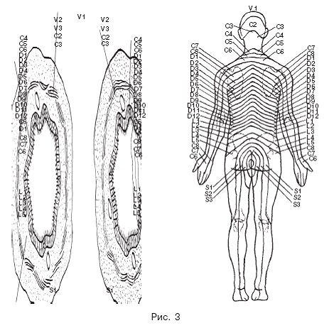 Прямолинейное поглаживание выполняется в продольном или поперечном направлении. Сначала массируется верхняя часть спины, участки С7-D10 (рис. 3). Затем производится массирование грудной области на участках D1-D9. После массирования грудного отдела переходят к шейному отделу (участки С4-С6).