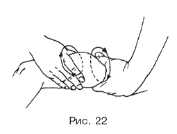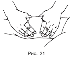 Поперечное разминание выполняется следующим образом: пальцы рук накладываются на участок в виде треугольника (рис. 21). Указательные пальцы правой и левой руки слегка соприкасаются, а большие пальцы располагаются один под другим. В этом случае зона воздействия не очень большая. Если большие пальцы правой и левой руки отвести подальше друг от друга, чтобы они слегка соприкасались кончиками, то образуется более широкое основание треугольника, тогда зона воздействия немного больше. Разминание проводится как в прямом, так и в обратном направлении. Этот вид разминания имеет несколько разновидностей, но для массажа грудной области применяются двойное кольцевое, двойное кольцевое комбинированное, кругообразное разминание и его подвиды (кругообразное клювовидное, кругообразное фалангами четырех пальцев, кругообразное фалангами большого пальца и кругообразное основанием ладони), а также разминание основанием ладони с перекатом.