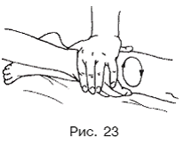 Массажист начинает двойное кольцевое разминание с захвата мышцы на участке. Его кисти располагаются поперек массируемого участка, а расстояние между ними составляет 5-6 см (рис. 22). Мышца приподнимается немного вверх и плотно захватывается выпрямленными пальцами. Правая рука смещает захваченный участок к себе, а левая – от себя. Движение происходит снизу вверх с интервалом в 2-3 см. Двойное кольцевое разминание следует проводить плавно, без сильных надавливаний и резких движений, иначе могут возникнуть болевые ощущения или кашель. Если же они появились, то массирование нужно временно прекратить и мягкими успокаивающими движениями погладить область груди. При возникновении кашля следует дать больному время для отхаркивания мокроты, затем нужно, чтобы он несколько раз глубоко вздохнул. Проверив, не возобновился ли кашель, возвращаются к разминанию. После выполнения двойного кольцевого разминания можно перейти к двойному кольцевому комбинированному разминанию. Правой рукой массажист захватывает мышцу и выполняет разминание пальцами, а левой проводит массаж ладонью (рис. 23). Кисти рук массажиста должны располагаться достаточно близко таким образом, чтобы указательный палец левой руки касался среднего пальца правой руки. В этом случае левая рука будет иметь дополнительную опору, а правая рука при массировании будет производить двойное давление на участок.