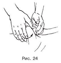 При выполнении валяния массажист двумя руками обхватывает массируемый участок. Пальцы при этом выпрямлены (рис. 24). Кисти располагаются параллельно друг другу, а все движения происходят в противоположных направлениях. Таким образом осуществляется перемещение по всему участку. Для грудной области подходит поверхностное валяние, так как при выполнении приема мышцы не испытывают сильного воздействия, а значит, и нет риска вызвать сильные болевые ощущения.