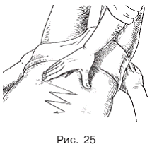 Похлопывание проводится расслабленной ладонью и пальцами. В данном случае лучше всего выполнять прием одной рукой, расположив ее поперек массируемого участка (рис. 25).