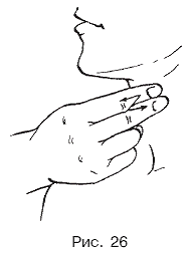 Сотрясение можно использовать на любом участке шейного отдела – с особой осторожность в области гортани. Данный прием выполняется двумя пальцами – указательным и средним, которые находятся по разные стороны гортани. Ими совершаются колебательные движения слева направо, справа налево и сверху вниз (рис. 26).