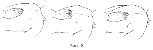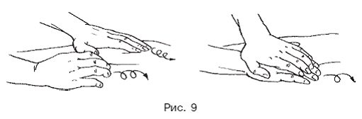 При растирании подушечками четырех пальцев кисть руки опущена на поверхность массируемого участка (рис. 8). В этом случае большие пальцы будут выполнять дополнительное растирание. Если кисть руки немного приподнять, а пальцы поставить под углом друг к другу и таким образом продвигать их по массируемому участку, то большие пальцы не будут принимать участия в растирании.
