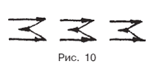 Кроме прямолинейного, применяются разные виды других поглаживаний. Все они помогают лучше воздействовать на организм. Зигзагообразное поглаживание (рис. 6) имеет различные техники выполнения, но наиболее часто массажисты проводят данный прием подушечками четырех пальцев. Данное поглаживание можно выполнять как одной, так и двумя руками. Проводится оно в быстром темпе, кисть руки при Рис. 6 этом плавно поворачивается и меняет направление. Движением кисти сверху вниз на участке производятся зигзаги. В медленном темпе зигзагообразное поглаживание проводится одной рукой с отягощением.