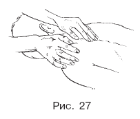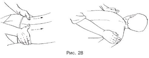 Поглаживание большим пальцем проводится на каком-либо небольшом участке, затем происходит смещение на другой участок. При этом четыре пальца противостоят большому и выполняют роль опоры (рис. 27). Подобное поглаживание лучше всего осуществлять в области позвоночного столба. Кроме фаланг пальцев, при массировании применяют ладонь и пальцы (рис. 28). Поглаживание лучше всего начинать от зоны шейного отдела и заканчивать посередине спинной области. Массаж столь большого участка улучшит состояние организма.