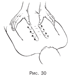 Если массирование проводится концевыми фалангами больших пальцев, то четыре пальца могут быть согнуты и двигаться по коже чуть впереди больших пальцев. При этом получается двойное растирание. Основное движение производится концевыми фалангами больших пальцев, а вспомогательное – фалангами четырех пальцев. При этом пальцы также могут быть выпрямлены, тогда они будут чуть касаться кожи при движении больших пальцев вперед (рис. 30).