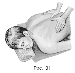 Пиление выполняется на более протяженных участках, чем штрихование. Пиление весьма эффективно, так как благодаря ему хорошо массируются мышцы верхней части спинной области. Данный прием осуществляется ребром ладони, в быстром темпе, короткими энергичными движениями. Его можно выполнять одной или двумя руками (рис. 32). Движения могут проводиться в одном направлении или хаотично.