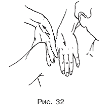 Если массажист выполняет растирание концевыми фалангами четырех пальцев, то кисть руки может быть опущена на поверхность массируемого участка (рис. 31). В этом случае большие пальцы будут выполнять дополнительное растирание. Если кисть руки приподнята, а пальцы занимают положение под углом друг к другу, то большие пальцы не будут принимать участие в массировании.