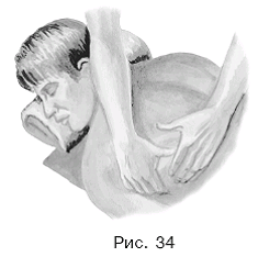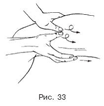 Пересекание осуществляется лучевым краем кисти. Большой палец при этом отводится далеко в сторону. В данном положении кисть обхватывает нужный участок и производит растирание (рис. 33). Движения при пересекании можно проводить как от себя, то есть в направлении указательного пальца, так и к себе – в направлении большого пальца. Прием выполняется как одной, так и двумя руками. В последнем случае кисти рук тыльными поверхностями располагаются на расстоянии 2-3 см друг от друга. Использование двух рук при пересекании дает более глубокое смещение тканей, которые сдвигаются попеременно в поперечном направлении от себя или к себе. Как и при пилении, на массируемом участке должен возникать своеобразный валик из смещенных тканей.