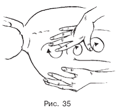 Реже кругообразное массирование проводится пальцами, сложенными в виде розетки. В этом случае движения совершаются в сторону мизинца или указательного пальца.