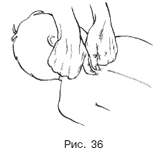 При разминании пальцами, сжатыми в кулак, большой палец играет роль опоры (рис. 36). Он упирается в определенную точку на участке и фиксирует положение кисти. Фаланги сжатых в кулак пальцев тыльной стороной придавливают мышцу и смещают ее в сторону мизинца. Данный прием выполняется как одной, так и двумя руками. Но массажисты нередко используют для выполнения приема одну руку, а второй производят отягощение. При массировании довольно часто комбинируют разминание кулаком одной руки с разминанием кулаками обеих рук, а также с разминанием кулаком одной руки с отягощением.