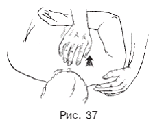 Следующий прием разминания – надавливание. Оно выполняется в виде коротких быстрых надавливаний концевыми фалангами больших пальцев на нужный участок (рис. 37). Затем происходит перемещение на другой участок. Кисти должны находиться на расстоянии примерно 10 см друг от друга. Надавливания лучше всего совершать в среднем или быстром темпе, приблизительно 20—25 раз в минуту. Движения проводятся сверху вниз или снизу вверх. Если надавливание массируемый ощущает слабо, то прием можно выполнять одной рукой с отягощением. При этом происходит дополнительное воздействие на большой палец. Его можно осуществлять сжатыми в кулак пальцами, которые накладывают на пальцы другой руки, выполняющие прием.