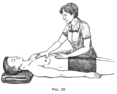 Хороший эффект при разминании дает смена продольного и поперечного движений. При массировании области груди их можно выполнять попеременно 5-6 раз. После сдвигания проводят надавливание. Это весьма простой, но достаточно эффективный прием, который имеет несколько разновидностей в технике выполнения. Это может быть надавливание подушечками пальцев, фалангами пальцев, ладонями, основаниями ладоней. При надавливании подушечками пальцев массажист держит большой палец в максимально удаленном положении от остальных пальцев или использует его в качестве опоры. Если надавливание проводится подушечкой большого пальца, то четыре остальных будут играть роль опоры. Надавливание производится в быстром темпе и достаточно интенсивно, кроме области сердца.