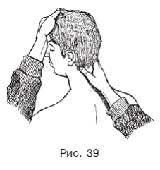 Поглаживание Так как шейная область не очень большая, то можно не говорить о продольном или поперечном поглаживании, хотя они также применяются. В большинстве случаев используется обхватывающее поглаживание. Для этого кисть и пальцы обхватывают массируемый участок в виде желоба. При выполнении приема массажист может поддерживать голову больного левой рукой (рис. 39), при этом большой палец сильно отставлен в сторону.